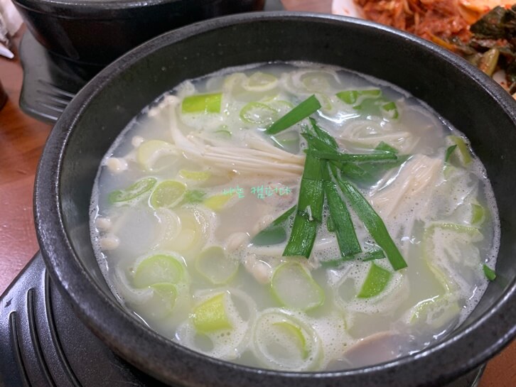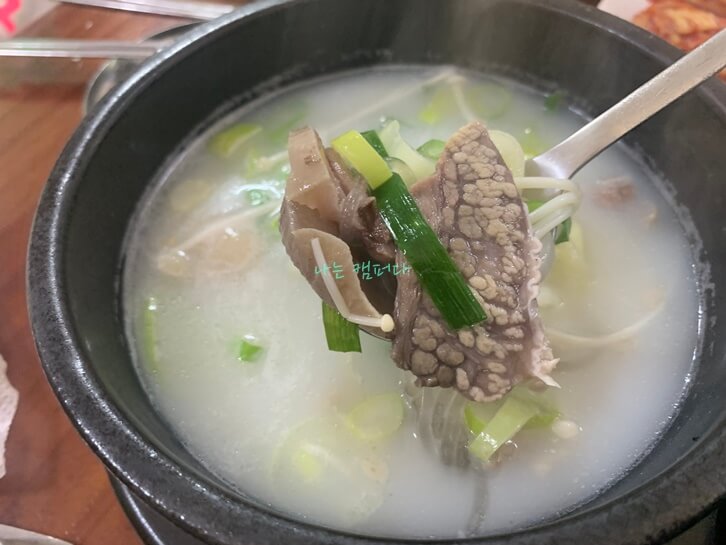 국물이 깔끔한 소머리국밥입니다. 고기가 많이 들어가 있지 않지만 국물 맛이 일품입니다. 기본적으로 심심하니 소금이나 다데기를 넣어 먹으면 더 맛있습니다.